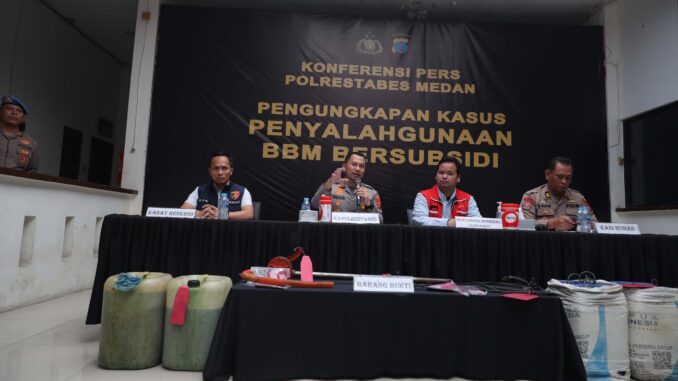MEDAN– Polrestabes Medan menggelar konferensi pers pengungkapan jaringan penyalahgunaan bahan bakar minyak (BBM) bersubsidi di Aula Satreskrim, Kamis (12/2/2026).