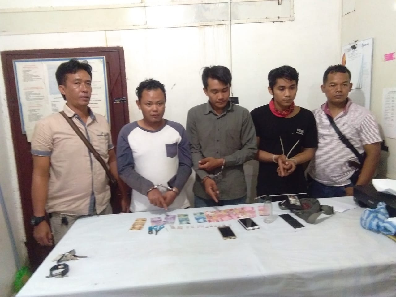 Keterangan Photo : Ketiga Tersangka Kasus Pidana Penyalahgunaan Narkotika Berikut Barang Bukti Saat Bersama Tim Opsnal Saat Di Mapolsek Bangun