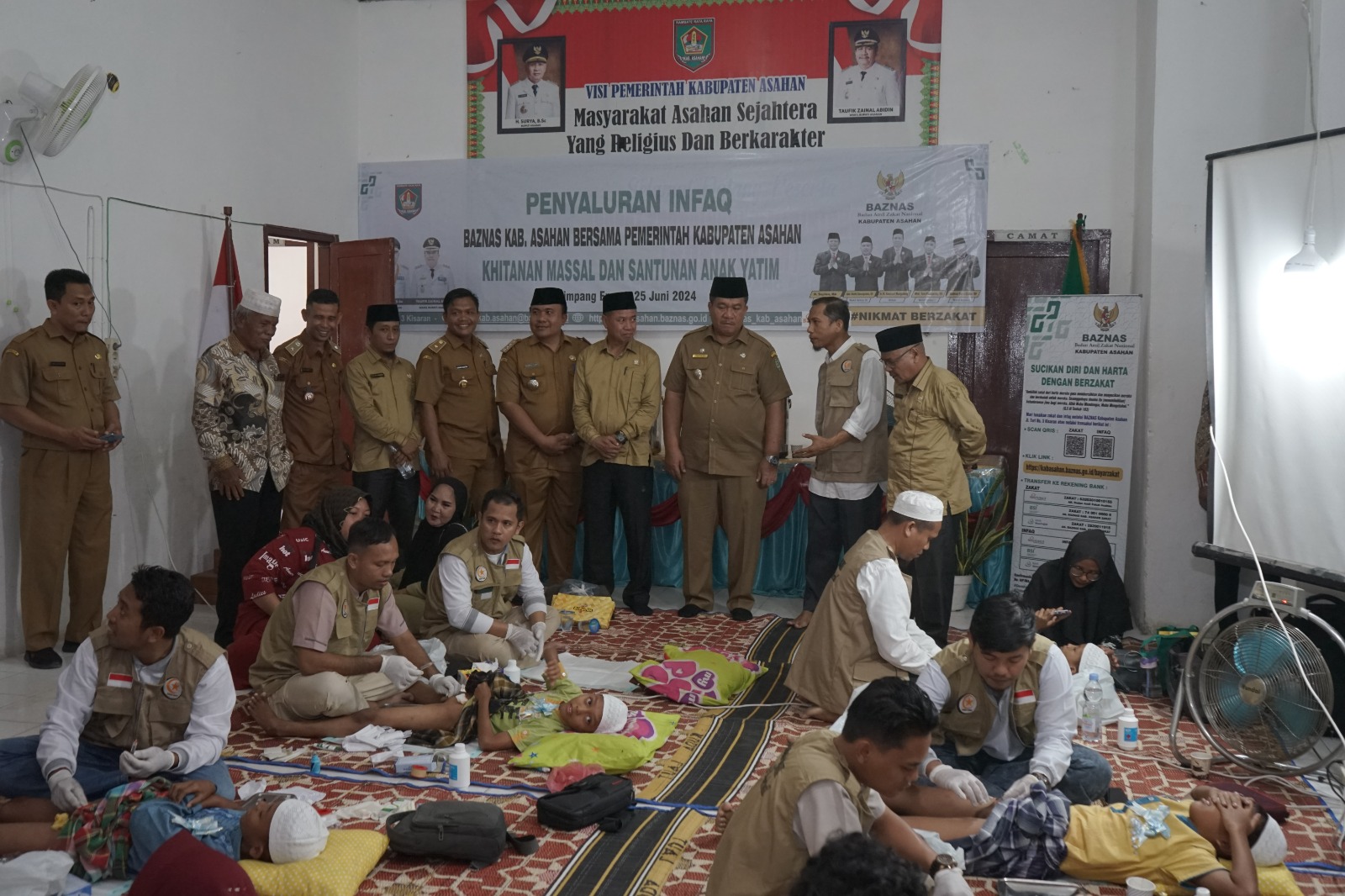 Pemerintah Kabupaten Asahan bersama dengan Baznas Kabupaten Asahan menggelar Khitanan Massal dan Santunan Anak Yatim di Lapangan Kantor Camat Simpang Empat, Selasa (25/06/2024).