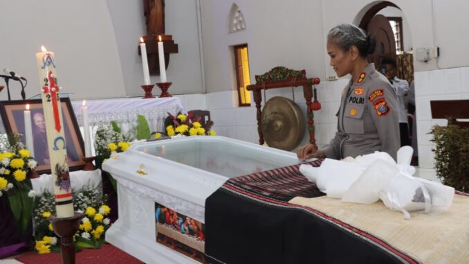Pematangsiantar – Kapolres Pematangsiantar AKBP Sah Udur T.M. Sitinjak, S.H., S.I.K., M.H., melayat jenazah Uskup Emeritus Mgr. Alfred Gonti Pius Datubara, OFMCap., Keuskupan Agung Medan di Gereja Katolik Paroki St. Laurentius Brindisi, Jalan Sibolga, Kota Pematangsiantar, Senin (20/10/2025) siang sekitar pukul 11.00 WIB.