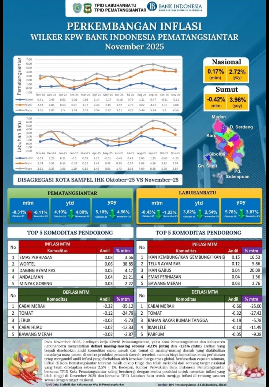 Laporan per November secara Month to Month (MTM) di Kota Pematangsiantar yakni Cabai Merah menyumbang andil deflasi -032 persen; Tomat -0,12 persen; dan Jeruk 0,02 persen.