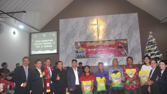 Sebagai wujud berbagi kasih di momen Natal, panitia menyerahkan 10 sak beras kepada para janda dan masyarakat, serta tali kasih kepada para hamba Tuhan yang hadir.