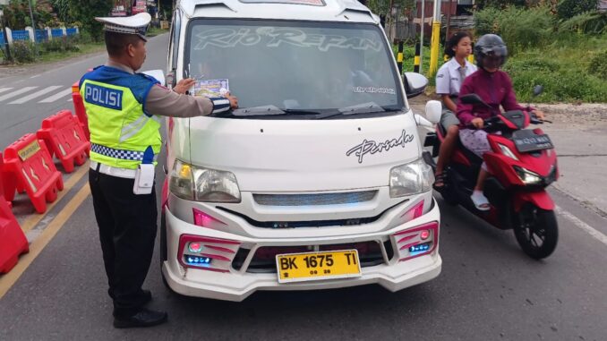 Pematangsiantar – Satuan Lalu Lintas (Sat Lantas) Polres Pematangsiantar melalui Kanit Kamsel IPDA Serly Tarigan bersama personel melaksanakan kegiatan pembagian brosur tertib berlalu lintas kepada masyarakat pengguna jalan di wilayah hukum Polres Pematangsiantar, Senin (6/4/2026) sekitar pukul 07.00 WIB.