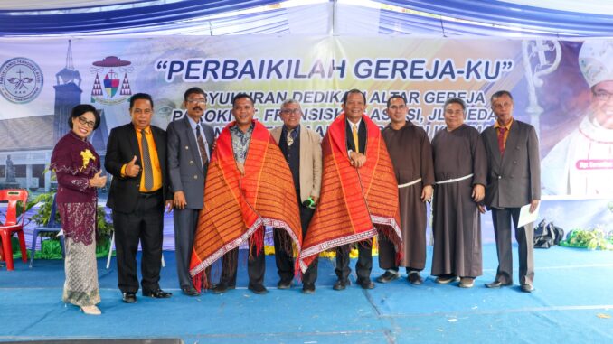 PEMATANGSIANTAR – Wali Kota Pematangsiantar Wesly Silalahi SH MKn diwakili Sekretaris Daerah (Sekda) Junaedi Antonius Sitanggang SSTP MSi menghadiri acara Syukuran Dedikasi Altar Gereja Paroki St Fransiskus Asisi Jalan Medan, dan Penerimaan Sakramen Krisma, Minggu (11/01/2026).