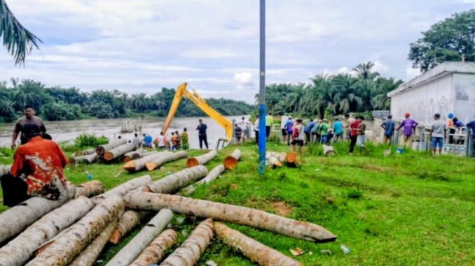Mereka memasang bronjong dari ratusan batang pohon kelapa di sayap Sungai Dalu Dalu dengan bantuan satu unit alat berat excavator yang dipinjamkan oleh Pemerintah Kabupaten Batu Bara.