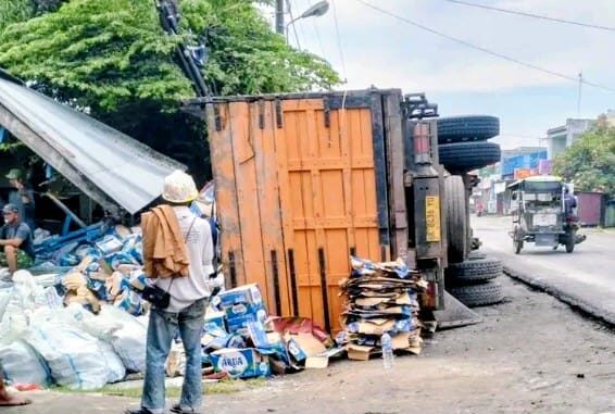 Namun, akibat membanting setir, salah satu roda truk masuk ke beram jalan yang cukup tinggi. Truk pun oleng dan akhirnya terbalik. Seluruh muatan air mineral berserakan di jalan raya.
