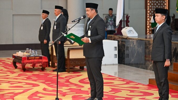 MEDAN – Gubernur Sumatera Utara (Sumut) Muhammad Bobby Afif Nasution melantik empat pejabat Pimpinan Tinggi Pratama (Eselon II) di lingkup Pemerintah Provinsi (Pemprov) Sumut. Bobby meminta agar pejabat yang baru dilantik bisa kerja lebih cepat dan tepat, terutama dalam penanganan bencana.
