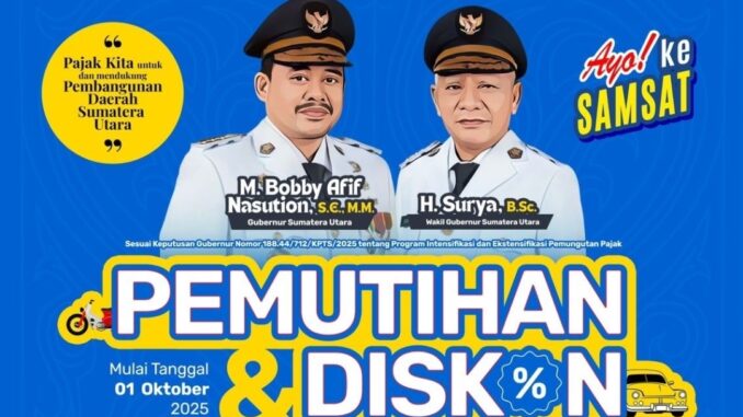 MEDAN – Pemerintah Provinsi (Pemprov) Sumatera Utara (Sumut) resmi memberlakukan program Pemutihan dan Diskon Pajak Kendaraan Bermotor (PKB) Tahun 2025, mulai 1 Oktober 2025. Melalui program ini, masyarakat mendapatkan berbagai keringanan, di antaranya bebas denda, diskon hingga 5 persen, serta sejumlah fasilitas lainnya.