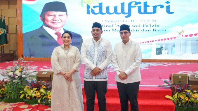 Medan- Wali Kota Medan Rico Tri Putra Bayu Waas menghadiri Open House Idulfitri 1447 yang diselenggarakan Gubernur Sumatera Utara Bobby Afif Nasution, Sabtu (21/3/2026).