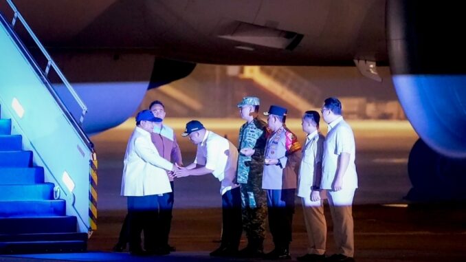 DELI SERDANG – Presiden Republik Indonesia Prabowo Subianto tiba di Bandara Kualanamu, Deliserdang, Jumat dini hari (12/12/2025), menggunakan pesawat kepresidenan setelah menyelesaikan rangkaian kunjungan kerja ke Pakistan dan Rusia.