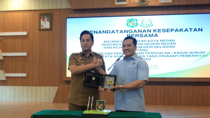 Kerja sama ini ditandai dengan penandatanganan Kesepakatan Bersama Antara Pemko Medan dengan Kejaksaan Negeri Medan dan Kejaksaan Negeri Belawan Tentang Penanganan dan Penyelesaian Persoalan/Kasus Hukum Perdata dan Tata Usaha Negara Yang Dihadapi Pemerintah Kota Medan, di Rumah Dinas Wali Kota Medan, Selasa (10/2/2026).