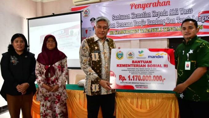 Pandan, Kliktodaynerws.Com-Pemerintah Kabupaten Tapanuli Tengah (Tapteng) diwakili Sekretaris Daerah (Sekdakab), Drs. Binsar TH Sitanggang pada Jum’at (6/3/2026) kemarin bertempat di Toba Room Pia Hotel Pandan sayalurkan dana Santunan kematian dari Kementerian Sosial kepada Ahli Waris Korban bencana banjir bandang dan tanah longsor di Kabupaten Tapteng.