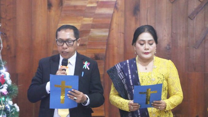 TAPUT– Bupati Tapanuli Utara Dr. Jonius Taripar Parsaoran Hutabarat, S.Si., M.Si., didampingi Ketua TP PKK Neny Angelina JTP Hutabarat serta para pimpinan perangkat daerah menghadiri Perayaan Natal Oikumene Kecamatan Pangaribuan dengan mengangkat tema “Allah hadir untuk menyelamatkan keluarga” (Matius 1:21–24) yang berlangsung di Gereja HKBP Pakpahan, Pangaribuan, (Senin, 8 Desember 2025).