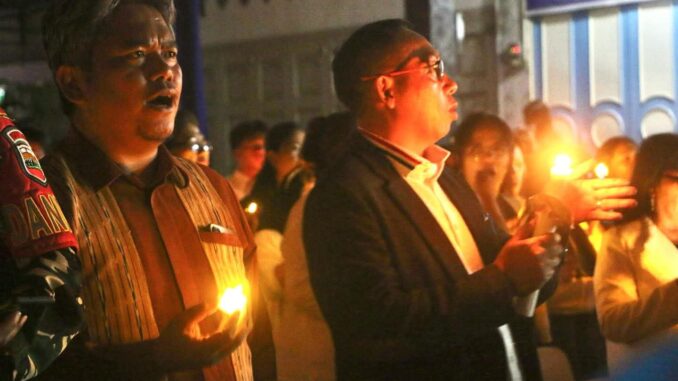 Taput – Bupati Tapanuli Utara Dr. Jonius Taripar Parsaoran Hutabarat, S. Si, M. Si bersama istri Ny. Neny Angelina JTP Hutabarat dan Wakil Bupati Dr. Deni Parlindungan Lumbantoruan, M. Eng bersama istri Ny. Lisa Deni P. Lumbantoruan memimpin Seruan Aksi Simbolik 1.000 lilin untuk mendoakan Tapanuli Utara pasca bencana alam lalu bertempat di Depan Gedung Sopo Partungkoan, jalan Sisingamangaraja-Tarutung (Minggu, 14 Desember 2025)