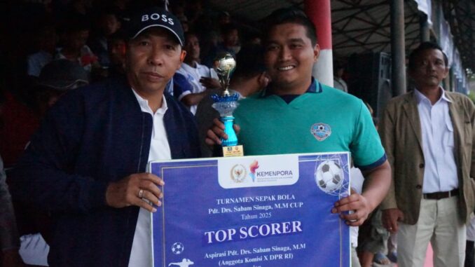 Taput – Bupati Tapanuli Utara Dr. Jonius Taripar Parsaoran Hutabarat, S.Si., M.Si saksikan pertandingan Final Turnamen Sepakbola Sabam Sinaga Cup 2025 di Lapangan Mini Siborongborong, Minggu, 9 November 2025).