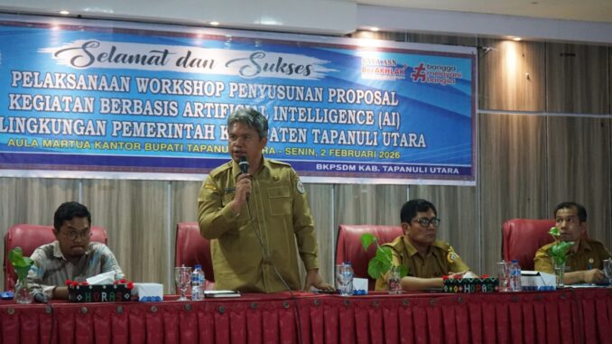 Taput – Pemerintah Kabupaten Tapanuli Utara terus mendorong percepatan transformasi digital di lingkungan birokrasi. Hal tersebut diwujudkan melalui Workshop Penyusunan Proposal Kegiatan Berbasis Artificial Intelligence (AI) atau Kecerdasan Buatan yang dibuka secara resmi oleh Wakil Bupati Tapanuli Utara Dr. Deni Parlindungan Lumbantoruan, M.Eng, didampingi Sekretaris Daerah Drs. Henry M. M. Sitompul, M.Si dan Pelaksana Tugas (Plt.) Kepala BKPSDM Jenri Simanjuntak, di Aula Martua Kantor Bupati Tapanuli Utara, Tarutung, Senin (2/2/2026).