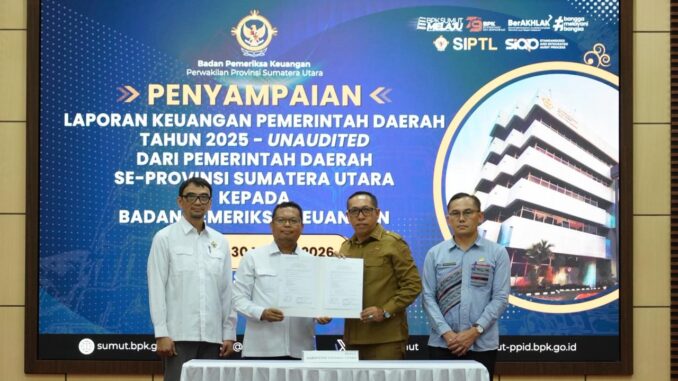 TAPUT – Pemerintah Kabupaten Tapanuli Utara secara resmi menyerahkan Laporan Keuangan Pemerintah Daerah (LKPD) Tahun Anggaran (TA) 2025 Unaudited kepada Badan Pemeriksa Keuangan (BPK) Republik Indonesia Perwakilan Provinsi Sumatera Utara. Penyerahan dokumen penting tersebut berlangsung di Auditorium Gedung BPK RI Perwakilan Sumut, Medan, Senin (30/3/2026).