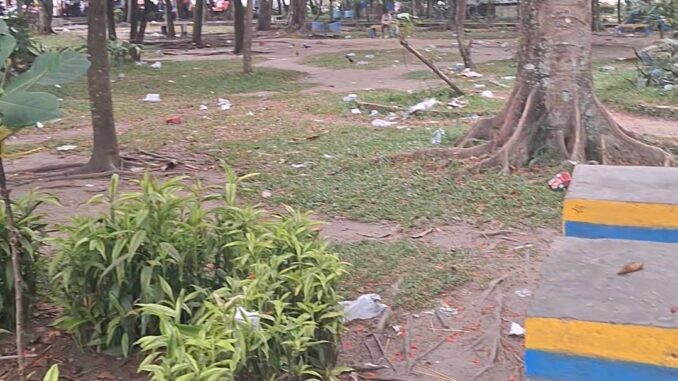 Berdasarkan pantauan pagi hari di lokasi, berbagai jenis sampah seperti plastik, sisa makanan, hingga botol minuman berserakan di hampir seluruh sudut taman.