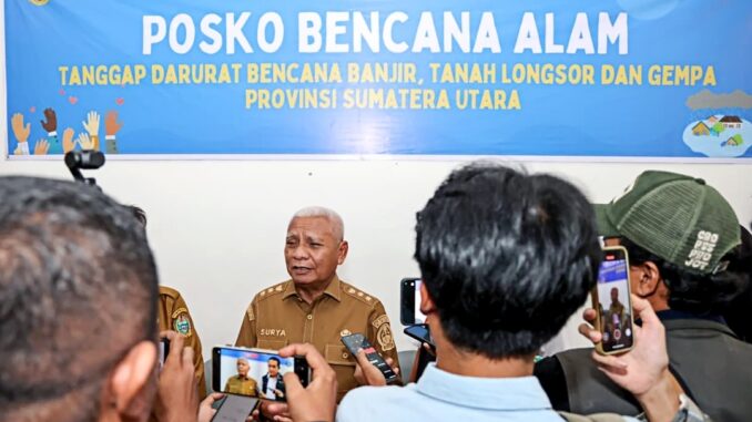 MEDAN – Wakil Gubernur (Wagub) Sumatera Utara (Sumut) Surya memastikan bahwa cadangan beras Bulog untuk para korban bencana alam di Sumut, dalam kondisi sangat mencukupi. Hal ini disampaikannya di Posko Darurat Bencana Pemerintah Provinsi (Pemprov) Sumut, Jalan AH Nasution, Senin (1/12) sore, didampingi oleh Kepala Perum Bulog Kantor Wilayah Sumut, Budi Cahyanto.
