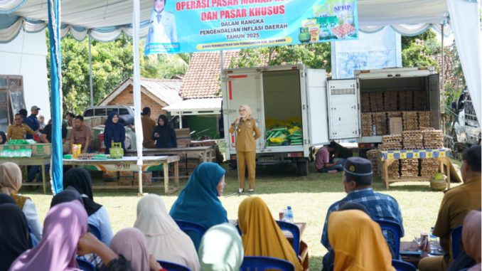Way Kanan – Bupati Way Kanan, Ayu Asalasiyah, S.Ked., membuka kegiatan Operasi Pasar Murah Reguler dan Pasar Khusus dalam Rangka Pengendalian Inflasi Daerah Tahun 2025, yang berlangsung di Lapangan Balai Kampung Bonglay, Kecamatan Banjit, Senin (27/10/2025).