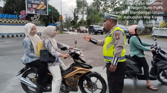 WAY KANAN- Satuan Lalu Lintas (Satlantas) Polres Way Kanan terus berupaya menjaga kelancaran arus lalu lintas Kanan dengan melaksanakan kegiatan pengaturan lalu lintas (gatur) pada pagi hari yang berlangsung di Simpang 4 Negeri Baru Kecamatan Umpu Semenguk Kabuapten Way Kanan.