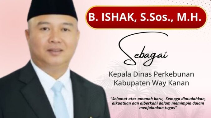B. Ishak yang juga menjabat sebagai Bendahara DPC GRANAT Way Kanan dilantik bersama tiga pejabat pimpinan tinggi pratama lainnya. Prosesi pelantikan dipimpin langsung oleh Sekretaris Daerah Kabupaten Way Kanan, Machiavelli HT, dan berlangsung di Ruang Rapat Utama Pemerintah Kabupaten Way Kanan.