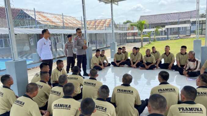 Way Kanan — Lembaga Pemasyarakatan Kelas IIB Way Kanan bekerja sama dengan Kepolisian Resor Way Kanan menggelar kegiatan pembinaan wawasan kebangsaan bagi warga binaan melalui program kepramukaan, Rabu (05/11). Kegiatan ini berlangsung di Gazebo Upacara Lapas dan diikuti oleh 31 warga binaan yang tergabung dalam Pembinaan Pramuka Lapas Way Kanan.