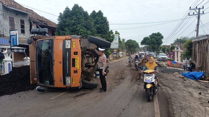 Way Kanan – Satuan Lalu Lintas (Satlantas) Polres Way Kanan bergerak cepat melakukan pengaturan arus lalu lintas pasca kecelakaan tunggal yang melibatkan satu unit truk tronton bermuatan batu bara di Jalan Lintas Sumatera (Jalinsum), tepatnya di Pasar Mingguan Kampung Gunung Katun, Kecamatan Baradatu, Kabupaten Way Kanan, Selasa (11/11/2025).